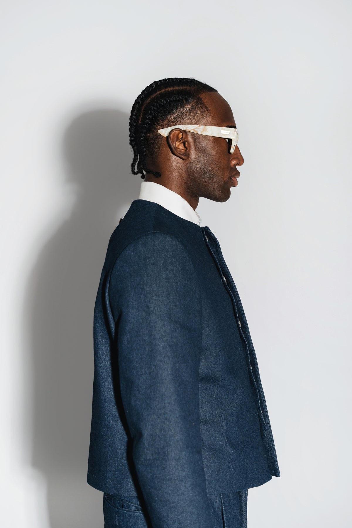 The Crewneck Cropped Jacket introduces a structured yet versatile form into denim. Its clean neckline, cropped proportions, and sharp tailoring reinterpret the traditions of workwear through the lens of refinement. Denim brings weight and texture, while the silhouette maintains the elegance of a tailored jacket. A piece designed to carry presence whether worn as a statement or layered with core staples.