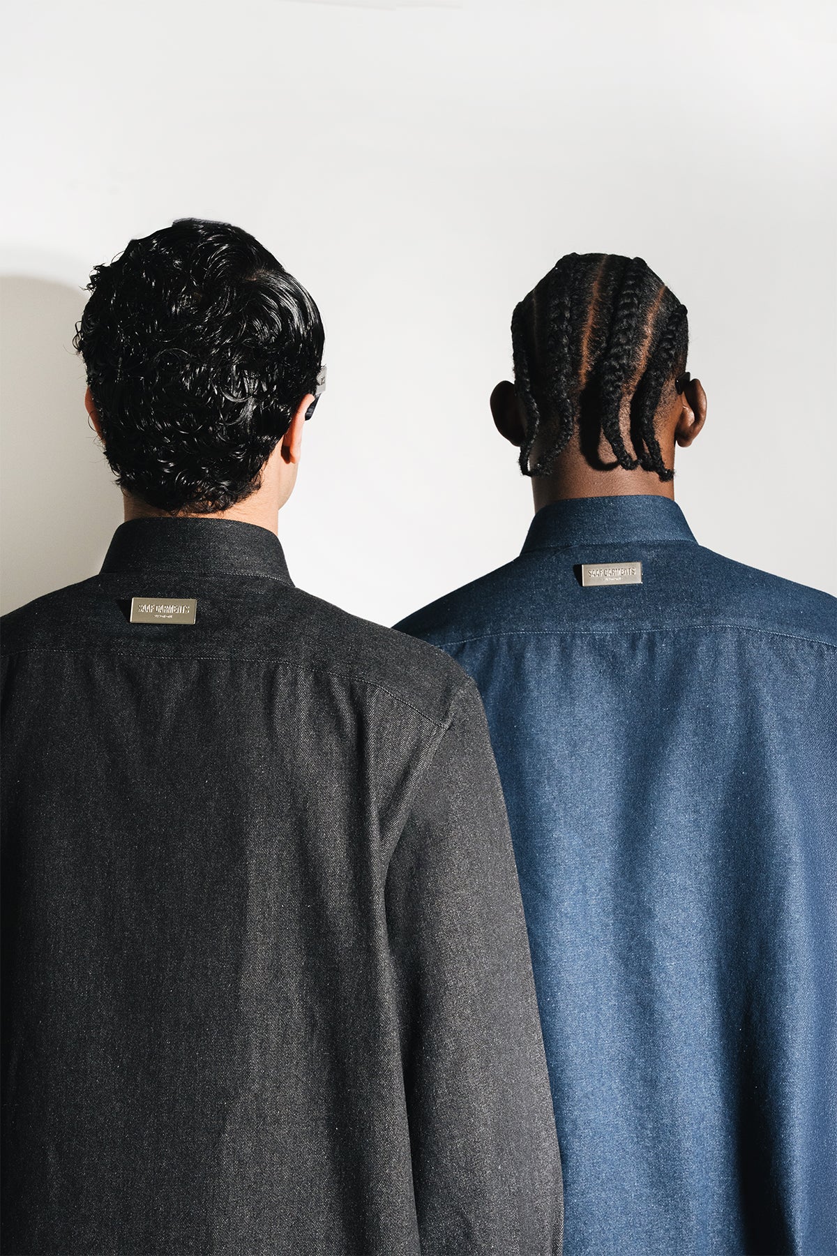 Proportions are amplified, the band collar refined, and the cut deliberately minimal. Rendered in denim, the shirt acquires a sculptural quality, balancing ease with structure. It is both a uniform and a canvas, bridging the casual codes of denim with the precise language of elevated tailoring.