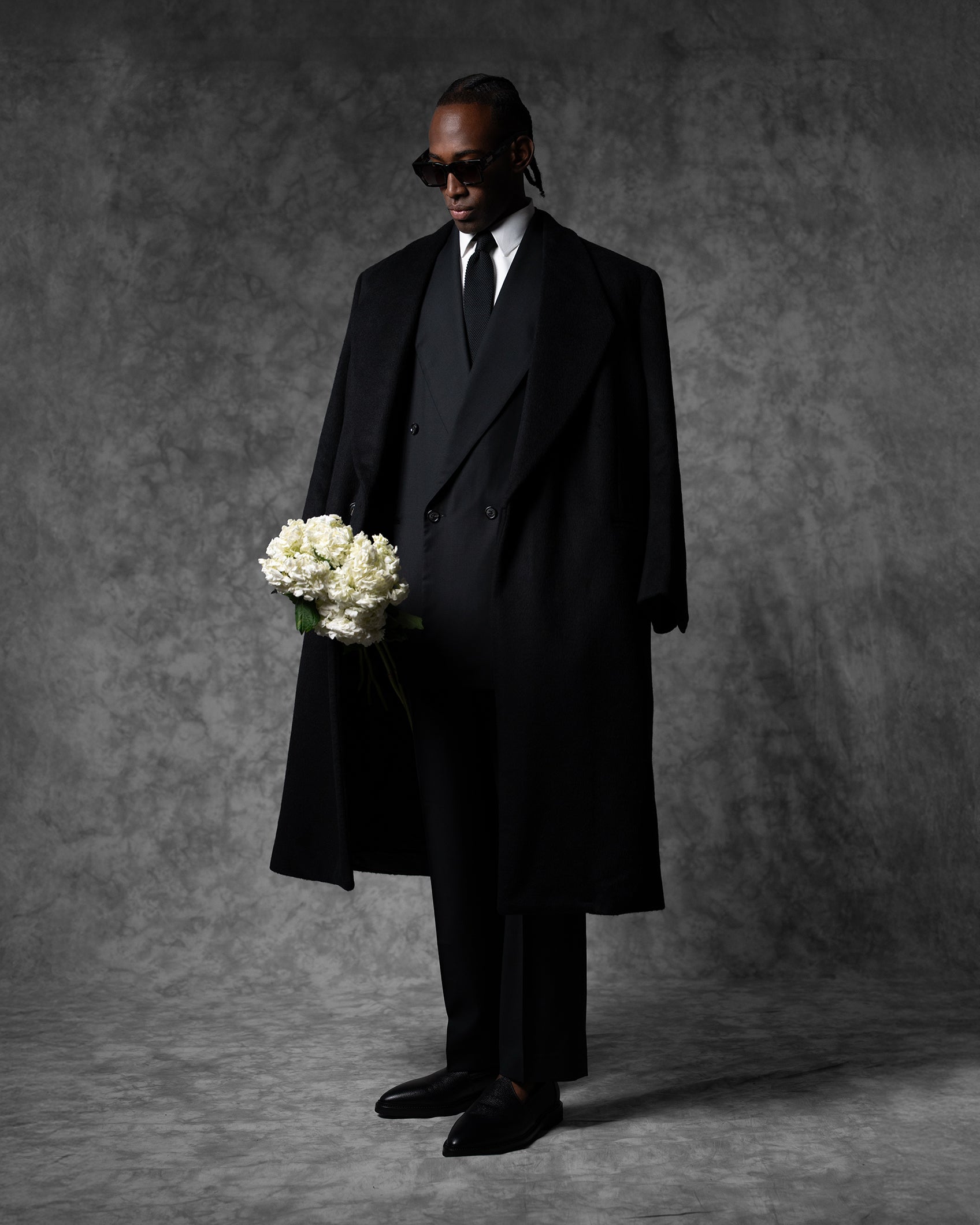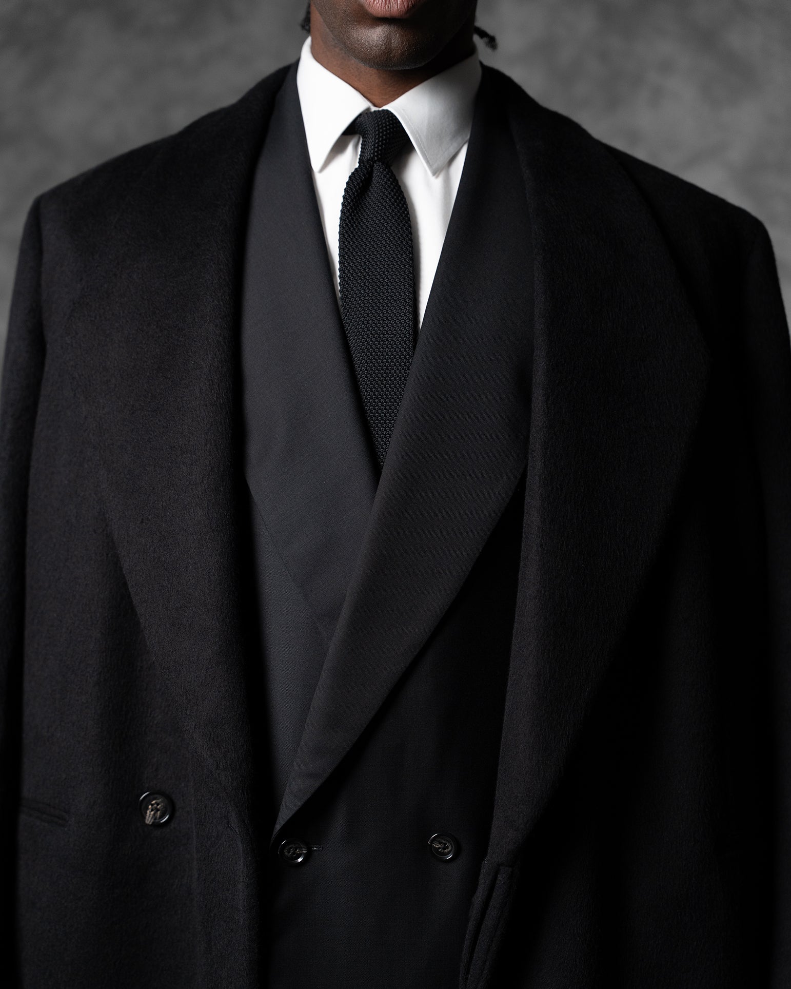The Alpaca Overcoat draws inspiration from the bold, iconic styles of early 1990s New York City, blending timeless elegance with modern edge. Crafted with a full canvas construction, this overcoat features structured shoulders that create a commanding, yet refined silhouette. The one-piece collar-lapel design adds a sleek, architectural touch, while hidden front horn buttons maintain a minimalistic, striking aesthetic. Inside, the coat is lined with luxurious cupro, offering both comfort and a smooth drape. Designed to drape along the full body, the extended length reaches beyond the knees, creating a dramatic, flowing effect that enhances its commanding presence.