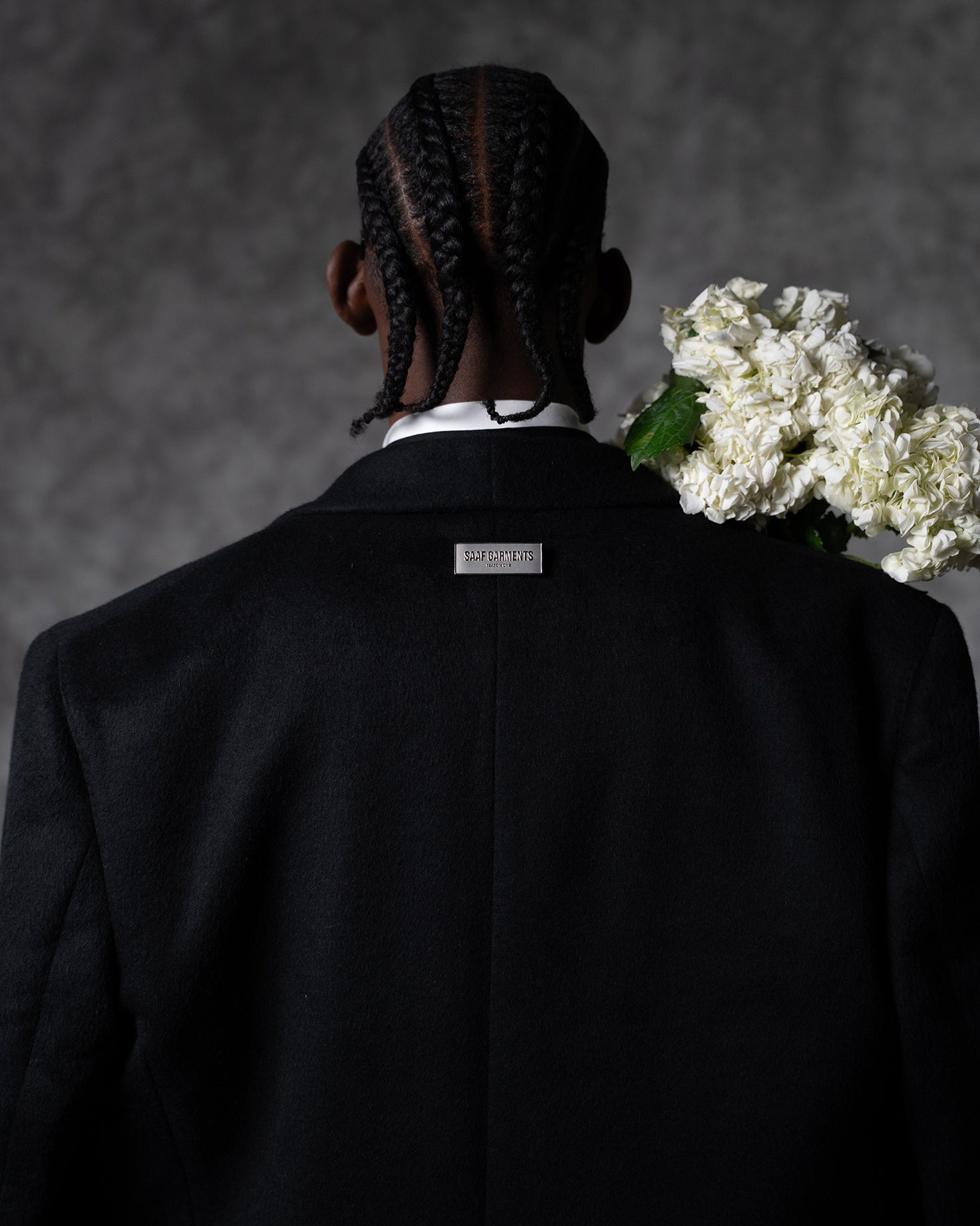 A removable SAAF GARMENTS metal pin comes affixed on the rear of the jacket.