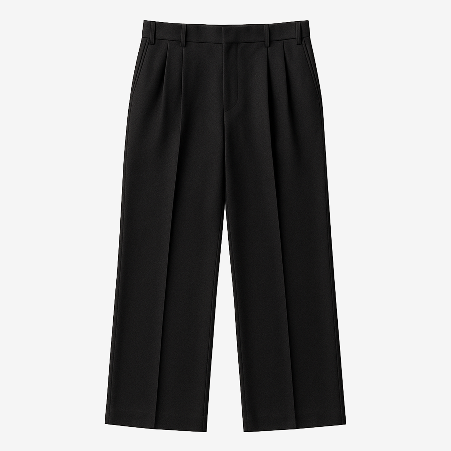 The High Waisted Wide Leg Pant, crafted from 100% wool, offers a relaxed yet polished silhouette. Featuring front double pleats for added structure, these pants provide a comfortable fit through the hips and thighs, with a straight leg that creates a clean, balanced look. The high-waisted design enhances both style and comfort, while the wool fabric ensures a refined texture with durability.