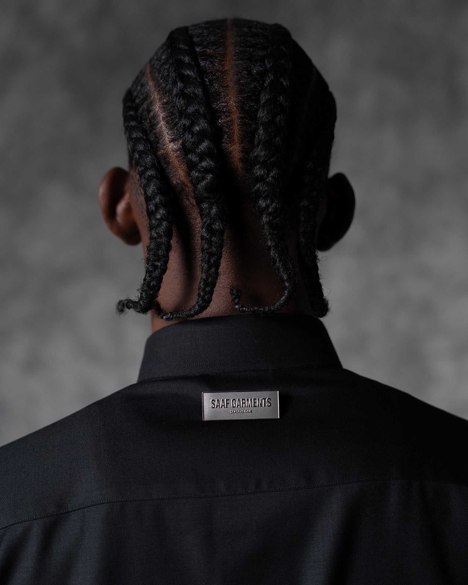 Our signature removable SAAF GARMENTS metal pin comes affixed at the rear of the shirt, serving as a refined brand marker.