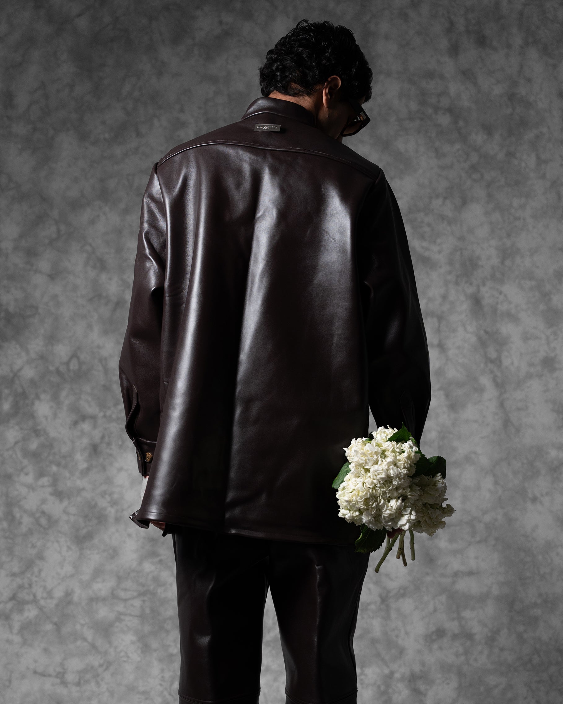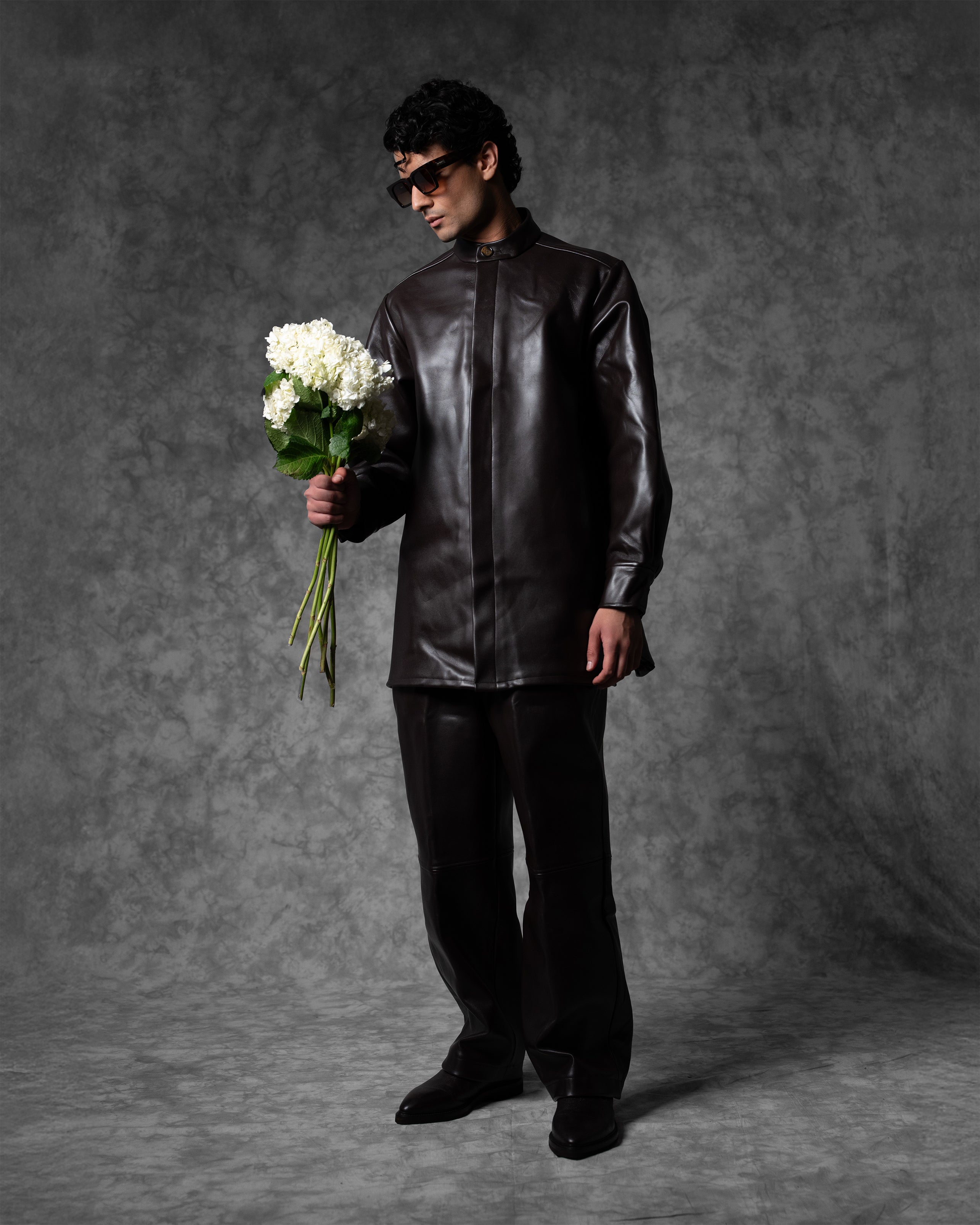 The Oversized Band Collar Shirt offers a minimalistic design with a voluminous fit throughout. It features a subtly enlarged band collar with a single visible top button. Natural horn buttons are hidden under a double-layered front closure.