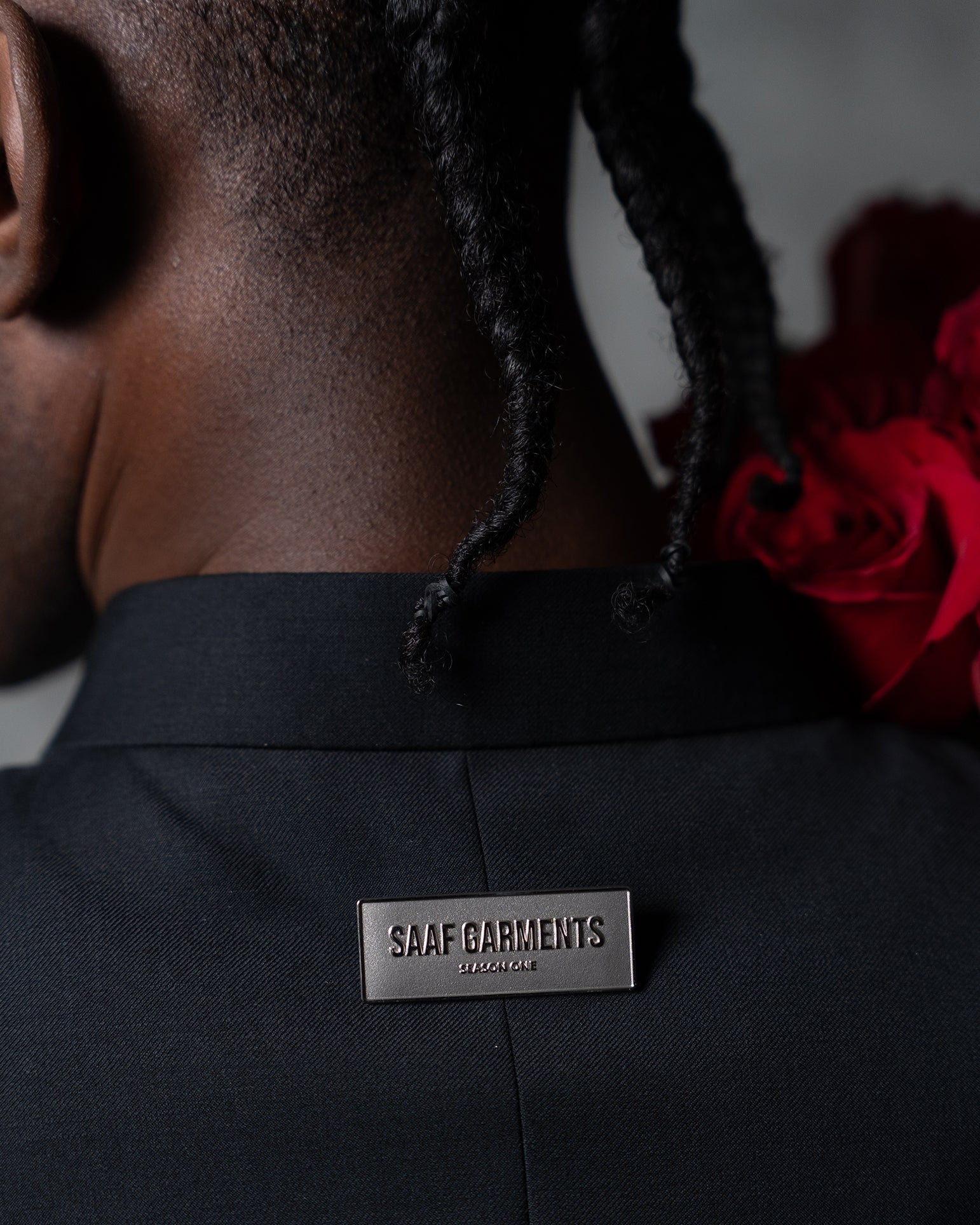 A removable SAAF GARMENTS Season One metal pin is affixed on the rear of the jacket.