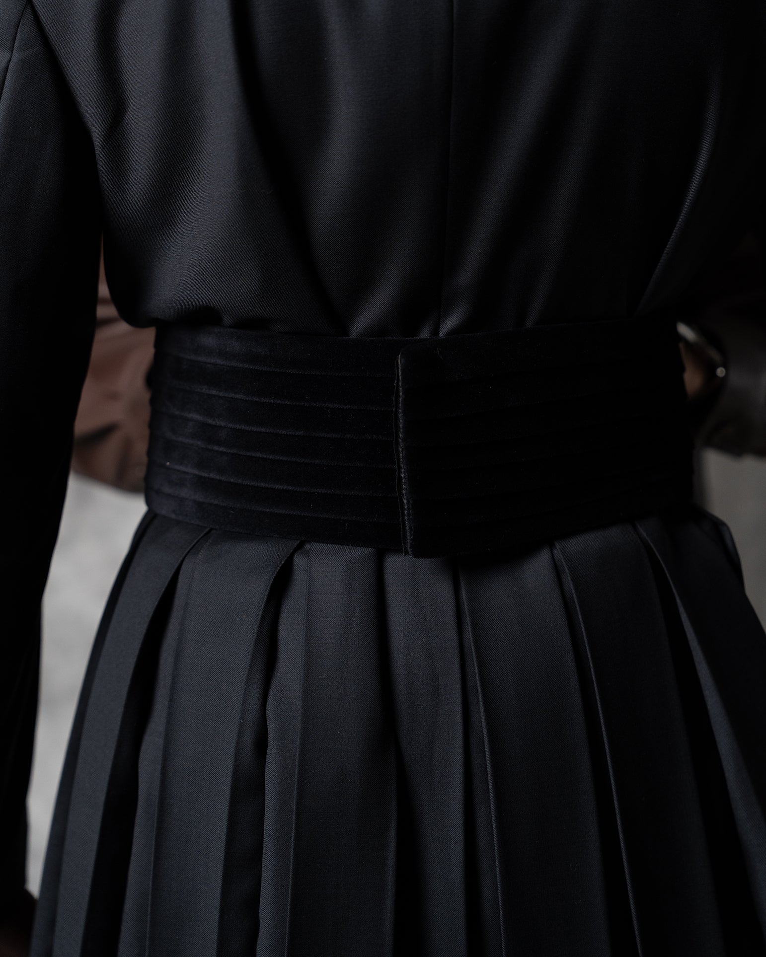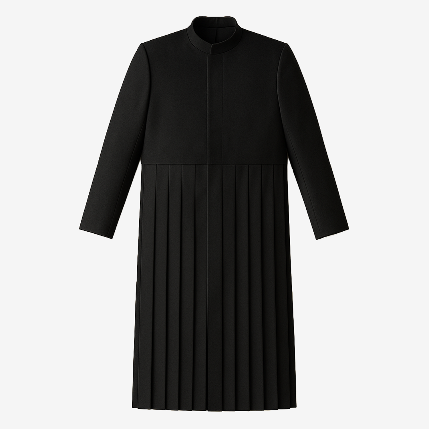 The Pleated Long Jacket has been reimagined in a refined wool fabrication, offering a polished update to its original design. The structured fit through the shoulders and chest remains, while the body drapes cleanly with generous ease at the waist for a relaxed yet tailored profile. Signature pleating enhances depth and movement, creating a dynamic, sophisticated silhouette. A double-layered closure conceals color-matched buttons, and the lower hem subtly flares for a sharp, contemporary finish.